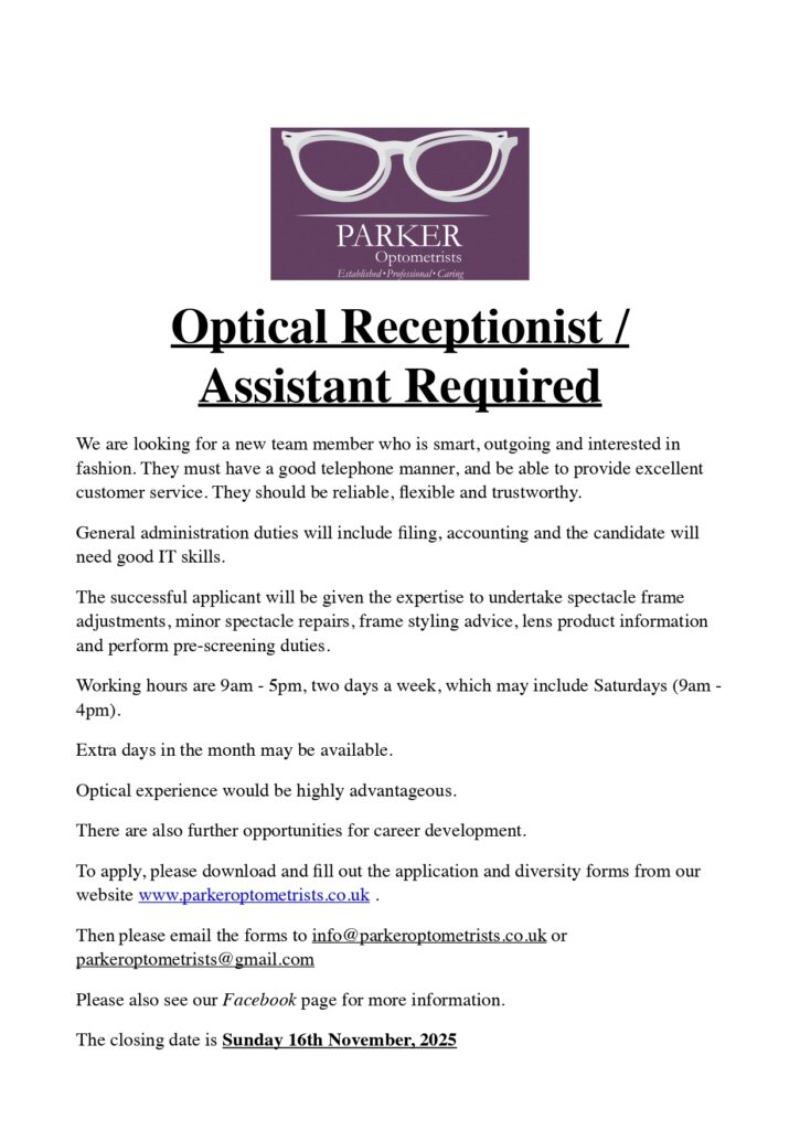 We are looking for a part time Optical Receptionist / Assistant to join our great, friendly team!